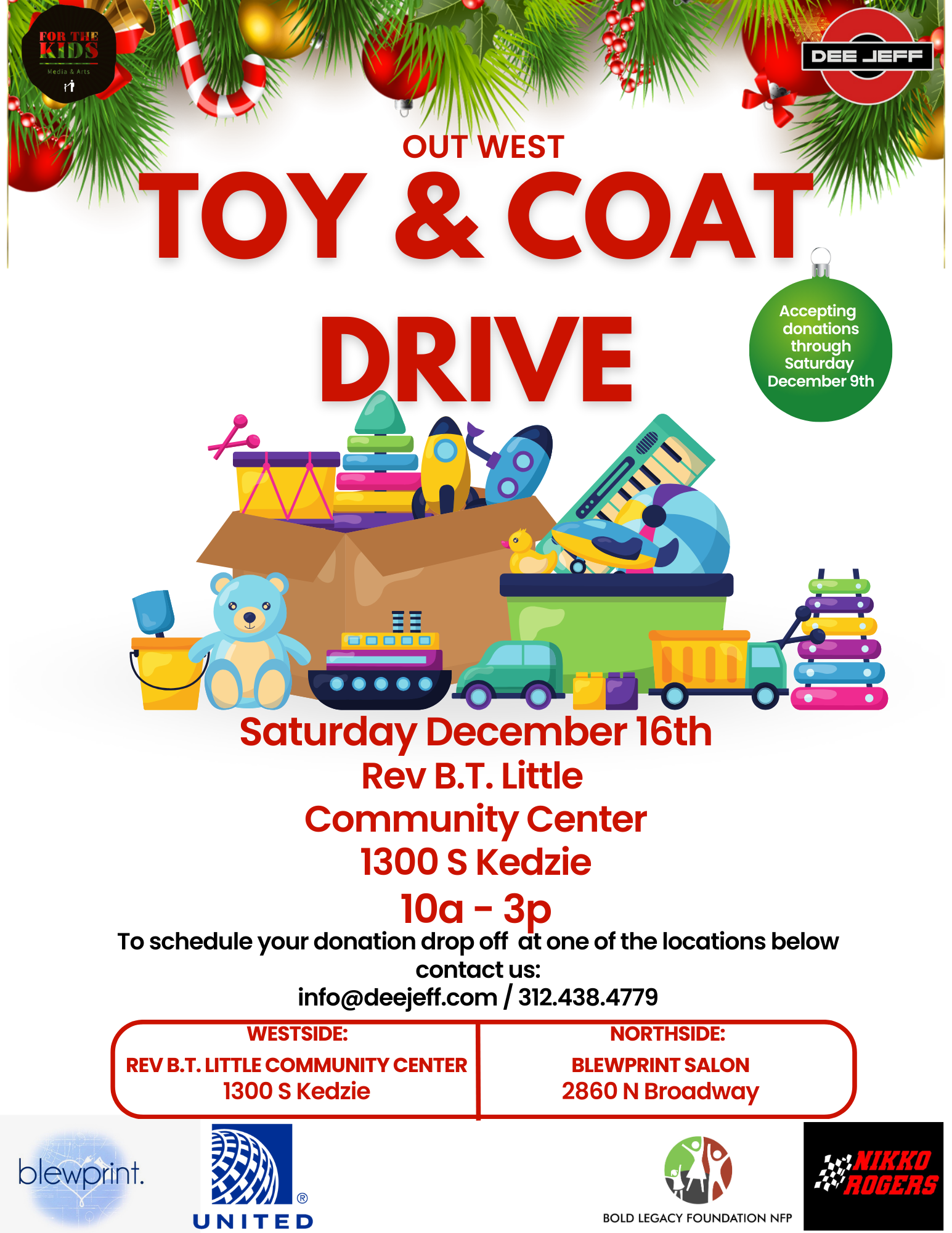 Our 2nd Annual Out West Toy & Coat Drive is happening this year on Saturday December 16th. We are accepting donations of new unopened toys and new and/or lightly used coats that will be repurposed and gifted to the less fortunate. Stop by one of our drop off locations before December 9th to help make a young personโs day this Holiday Season!
